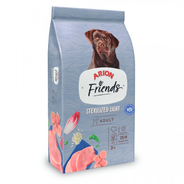 Arion Friends Sterilised Light é um alimento completo para cães esterilizados ou com excesso de peso. Sua fórmula com baixo teor de gordura e proteína de alta qualidade favorece o controle eficaz do excesso de peso e a condição corporal ideal. A incorporação de condroprotetores protege as articulações e a L-carnitina favorece o tônus muscular, contribuindo para uma melhor queima da gordura subcutânea. Incorpora altos níveis de fibras vegetais para aumentar a sensação de saciedade e plenitude gástrica e diminuir a ingestão em cães com apetite descontrolado.
